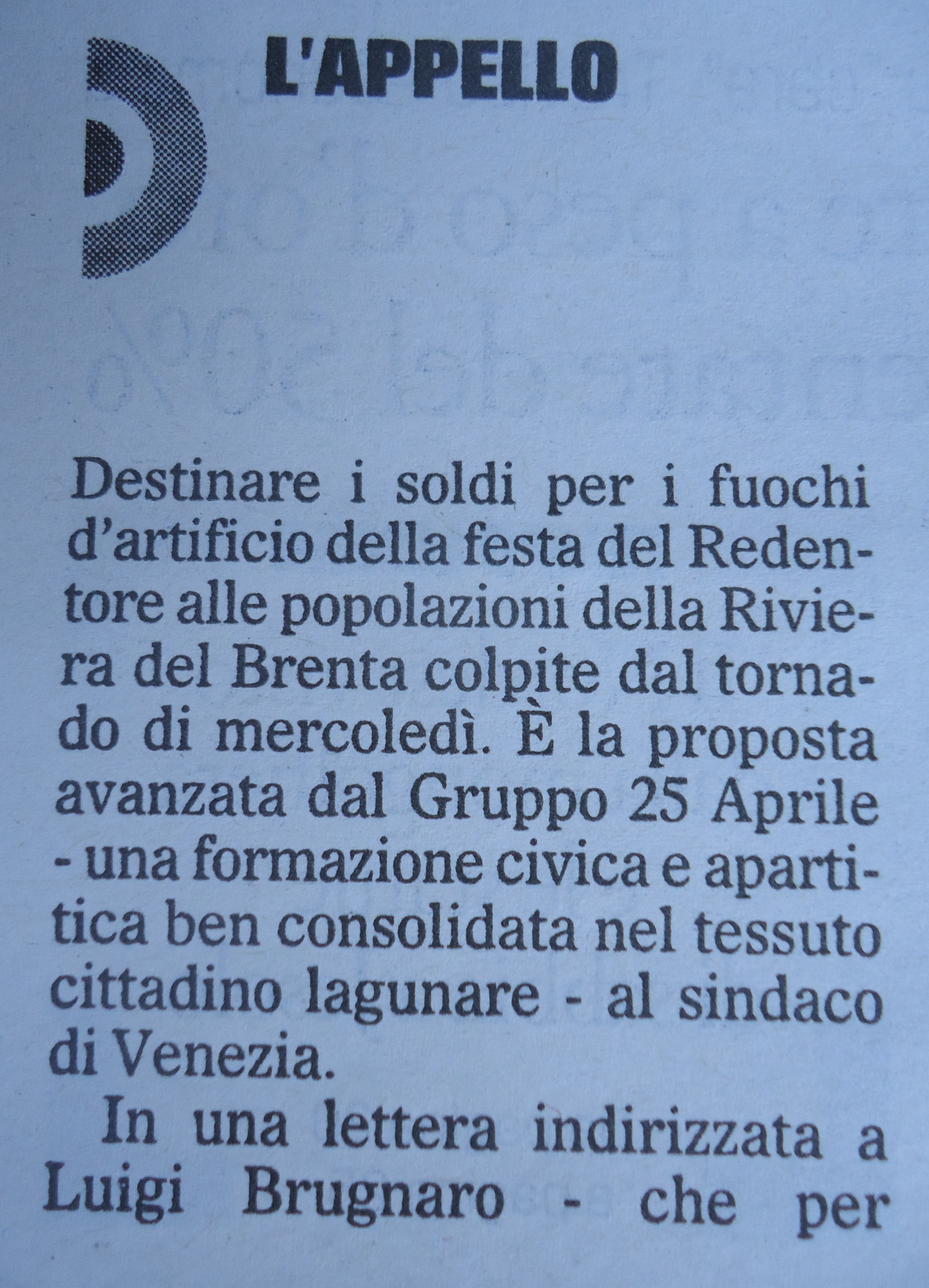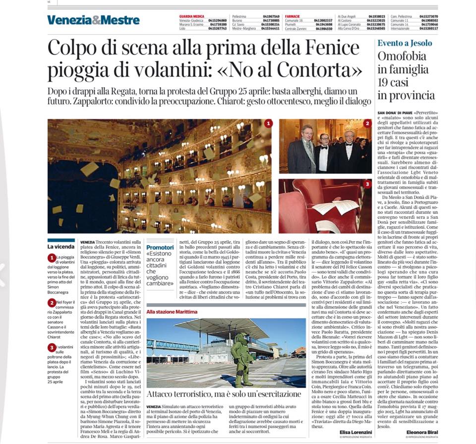 Uno sforzo corale che porta molte firme, quindi, come l’orchestra della Fenice (dove le firme sono fioccate numerose!) ma il successo mediatico degli striscioni sul Canal Grande, con il colpo d’occhio e la cornice da sogno che solo il “Canalazzo” poteva offire, non deve far dimenticare che queste due settimane hanno visto il lavoro instancabile (e non retribuito) di decine di volontari di ogni età e professione: la vera forza di questo movimento di opinione, trasversale e apartitico!