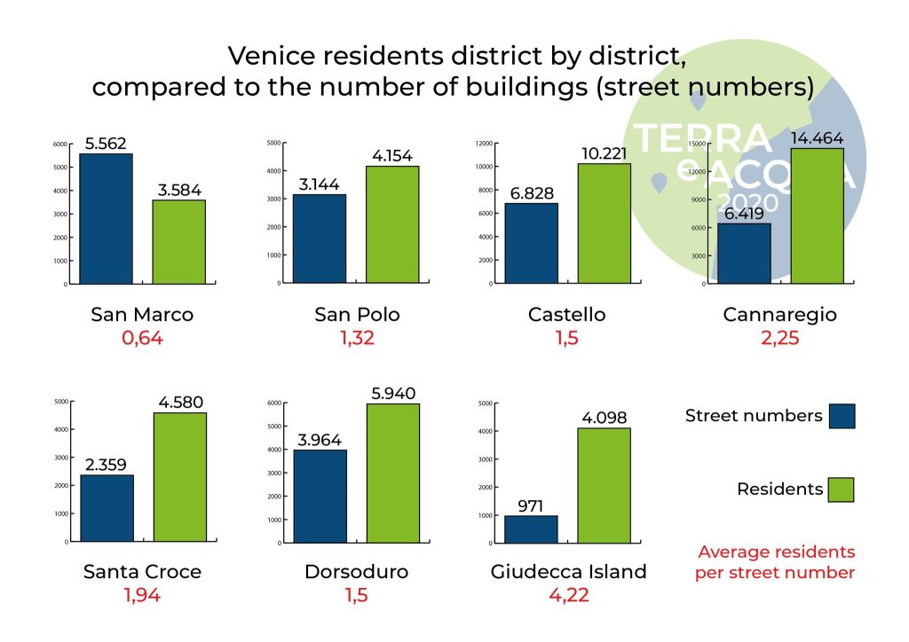 Per quanto il dato del sestiere di San Marco sia influenzato dal fatto che molti edifici avevano e continuano a svolgere una funzione pubblica o commerciale, i dati negli altri sestieri sono piuttosto sorprendenti, anche in quello che era il cuore pulsante delle classi popolari: “Castello” (senza dimenticare che l’Arsenale era stato il maggior datore di lavoro di Venezia fino al XIX secolo, e attualmente è invece utilizzato soltanto saltuariamente come vetrina per eventi come il salone nautico).