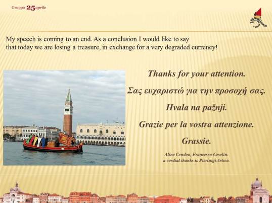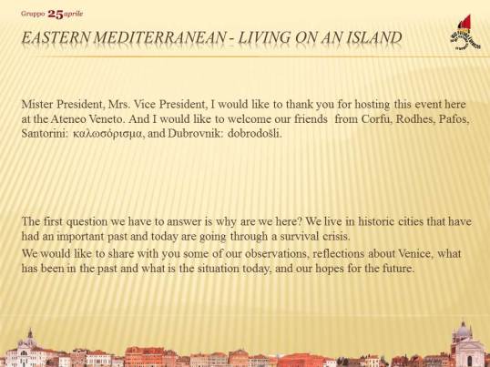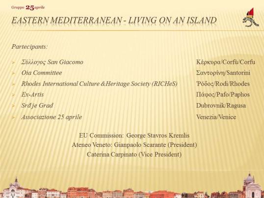 “Associazione San Giacomo” di Corfù, “Associazione 25 aprile” di Venezia, “Udruga Grad” di Ragusa (Dubrovnik), “exARTIS” di Paphos (Cipro) “RICHes” di Rodi e “Regno di Candia” dell’isola di Creta.