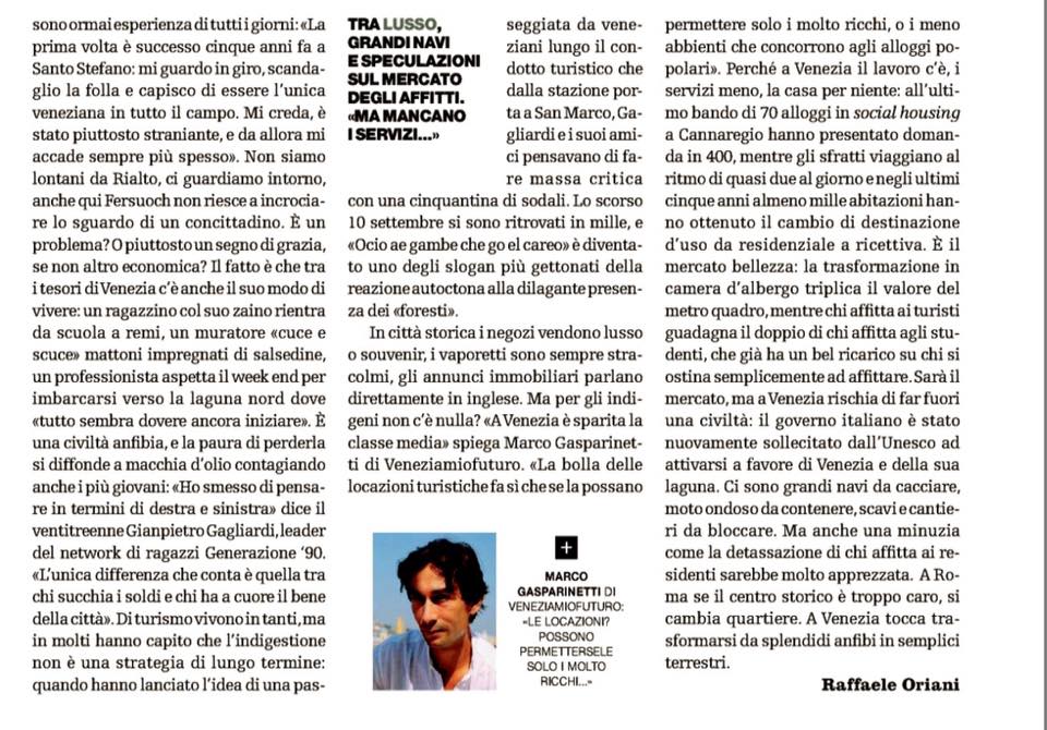 “Possiamo pensare a Venezia come alla nostra casa? Risiedervi ha un prezzo troppo alto da sostenere per le classi medie e meno abbienti, ed è questa la ragione fondamentale della progressiva suburbanizzazione di Venezia, che ha spostato sempre più persone e attività al di fuori della città storica.