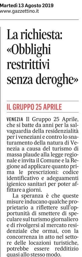 LEGGE CANER: dal nome dell’assessore Federico Caner, è la Legge Regionale del 19 giugno 2019, n. 23 recante “Disposizioni in materia di ricettività turistica” in sostituzione dell’art. 27 bis “Locazioni turistiche” della Legge Regionale 14 giugno 2013, n. 11, ed è una modifica legislativa per la quale ci battevamo dal 2017 (v. alla lettera A come Alloggi nel riquadro che segue, tratto da La Stampa del 20 gennaio 2017), al fine di mitigare gli effetti devastanti della liberalizzazione operata con la Legge regionale del 2013. A norma del nuovo art. 1 comma 2, gli alloggi privi della conformità alle prescrizioni urbanistiche, edilizie, igienico-sanitarie e alle norme per la sicurezza degli impianti non potranno più essere utilizzati ai fini della locazione turistica. Inoltre, ad ogni alloggio turistico verrà assegnato un codice identificativo unico “da utilizzarsi per pubblicizzare l’alloggio, anche su piattaforme digitali o siti internet di prenotazione ricettiva“, che dovrebbe facilitare i controlli in un settore protagonista di una crescita impetuosa e scarsamente regolamentata, a Venezia come nelle altre città d’arte italiane.