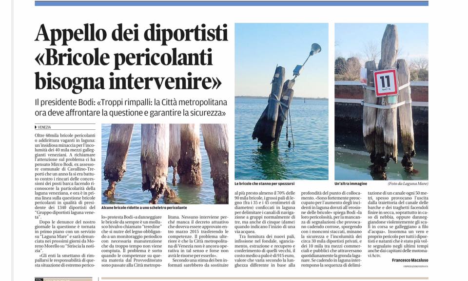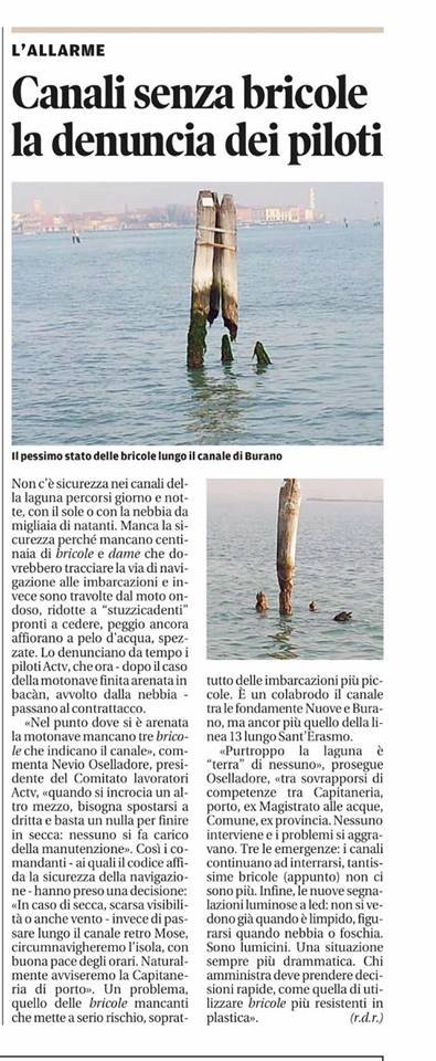 Gruppo25Aprile e Gruppo Diportisti Laguna Veneta stanno documentando in questi giorni lo stato di collasso in cui sono state lasciate decine e più probabilmente centinaia di bricole, con il conseguente pericolo per la navigazione e per l’incolumità delle persone – ulteriormente aggravato dalle condizioni di scarsa visibilità tipiche della stagione (giornate più brevi, nebbia o caìgo). Volete darci una mano, nell’interesse di tutti? Inviate le vostre foto corredate di data e luogo, se possibile indicando il numero della bricola mancante o danneggiata (o di quella più vicina) all’indirizzo: 25aprile2015@gmail.com